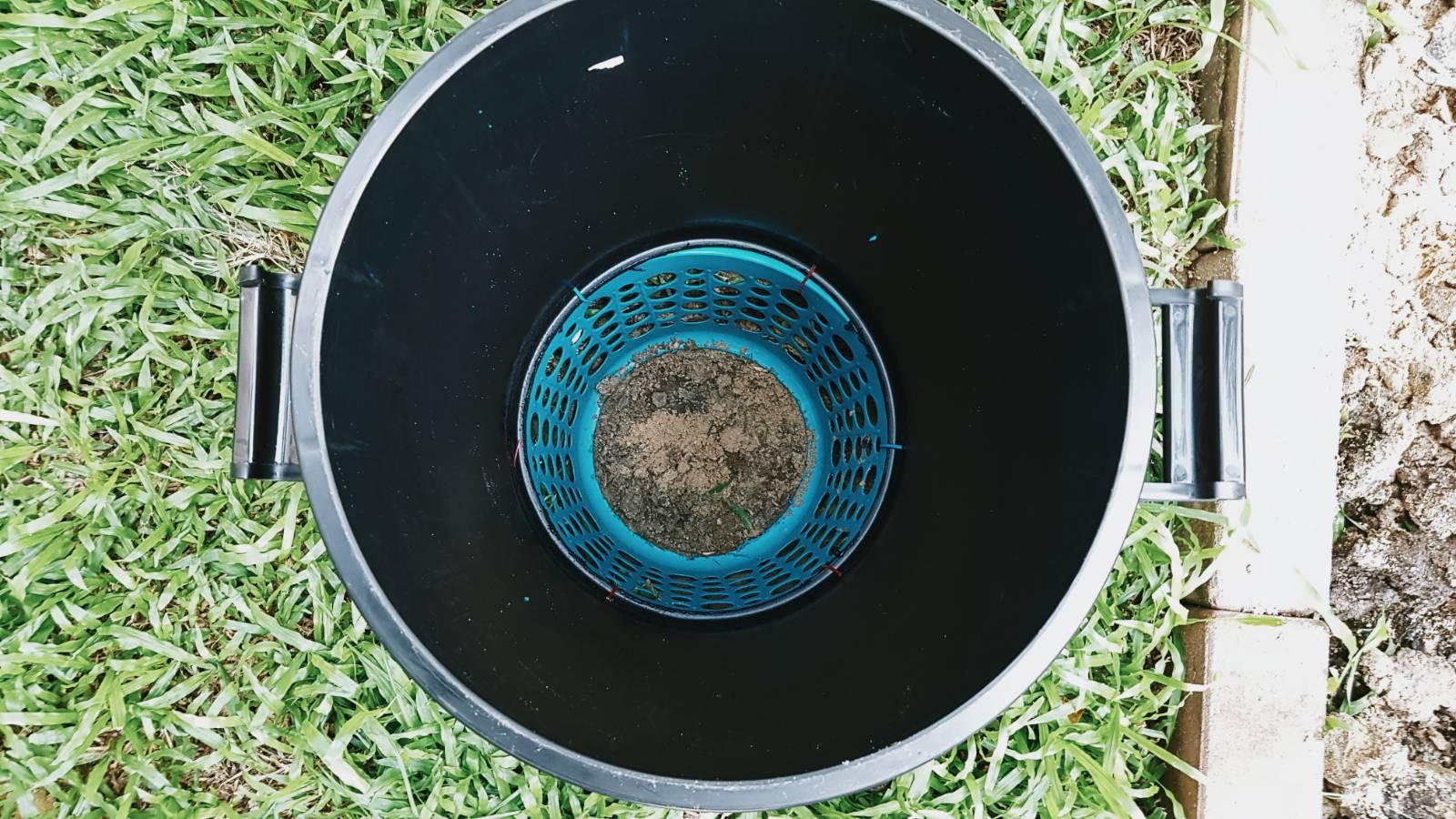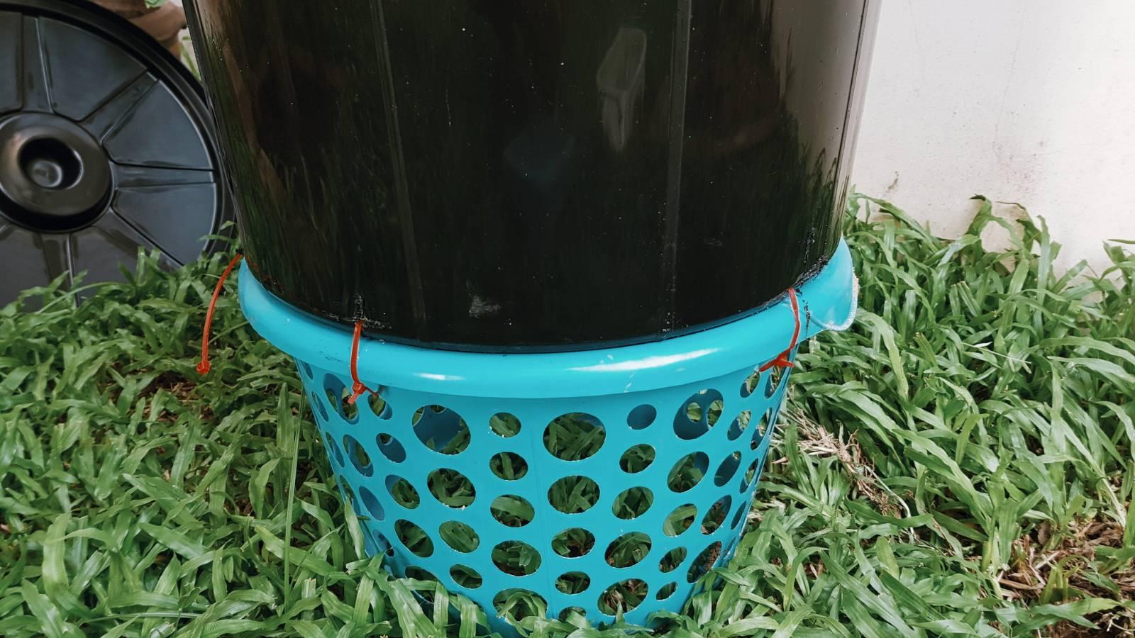 1. คว่ำถังพลาสติกขนาดเล็กลงในตะกร้า โดยให้มีความลึกลงไปจากปากตะกร้าประมาณ 5 -10 เซนติเมตร โดยจะต้องเหลือช่องของตะกร้าขึ้นมาจากปากถังที่คว่ำลงไป ประมาณ 2 ช่อง จากนั้นทำการตัดก้นถังพลาสติกใบเล็กออก