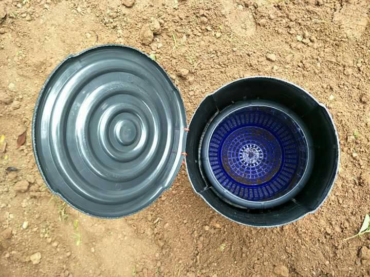 3. นำถังหมักรักษ์โลกที่ทำการประกอบเสร็จเรียบร้อยวางลงไปกลางหลุมที่ขุดไว้ และกลบด้วยดินที่ขุดขึ้นมา โดยการกลบจะต้องกลบแบบหลวมๆ ไม่อัดดินให้แน่น