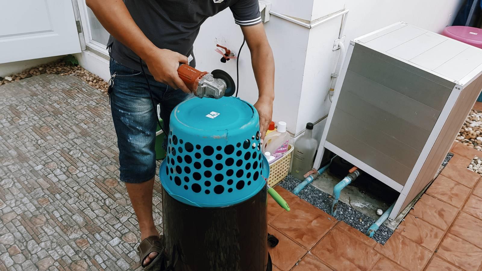 4. จากนั้นก็นำเศษอาหารที่เหลือจากครัวเรือนมาเททิ้งใส่ถัง โดยระมัดระวังไม่ให้เศษอาหารตกเข้าไปในช่องระหว่างถังพลาสติกใบเล็กและถังพลาสติกใบใหญ่