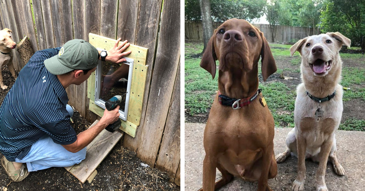 เพื่อนบ้านสร้างประตูสุนัขเล็ก ๆ ในรั้วเพื่อให้สุนัขของพวกเขาสามารถออกไปเที่ยวเจอกันเมื่อใดก็ตามที่พวกมันต้องการ