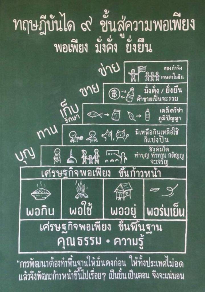 “...คนอื่นจะว่าอย่างไรก็ช่างเขา จะว่าเมืองไทยล้าสมัย ว่าเมืองไทยเชย ว่าเมืองไทยไม่มีสิ่งที่สมัยใหม่ แต่เราอยู่พอมีพอกิน และขอให้ทุกคนมีความปรารถนาที่จะให้เมืองไทย พออยู่พอกิน มีความสงบ และทำงานตั้งจิตอธิษฐานตั้งปณิธาน ในทางนี้ที่จะให้เมืองไทยอยู่แบบพออยู่พอกิน ไม่ใช่ว่าจะรุ่งเรืองอย่างยอด แต่ว่ามีความพออยู่พอกิน มีความสงบ เปรียบเทียบกับประเทศอื่นๆ ถ้าเรารักษาความพออยู่พอกินนี้ได้ เราก็จะยอดยิ่งยวดได้...” (๔ ธันวาคม ๒๕๑๗)