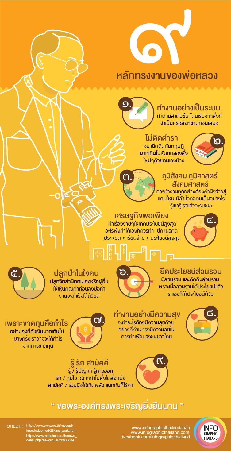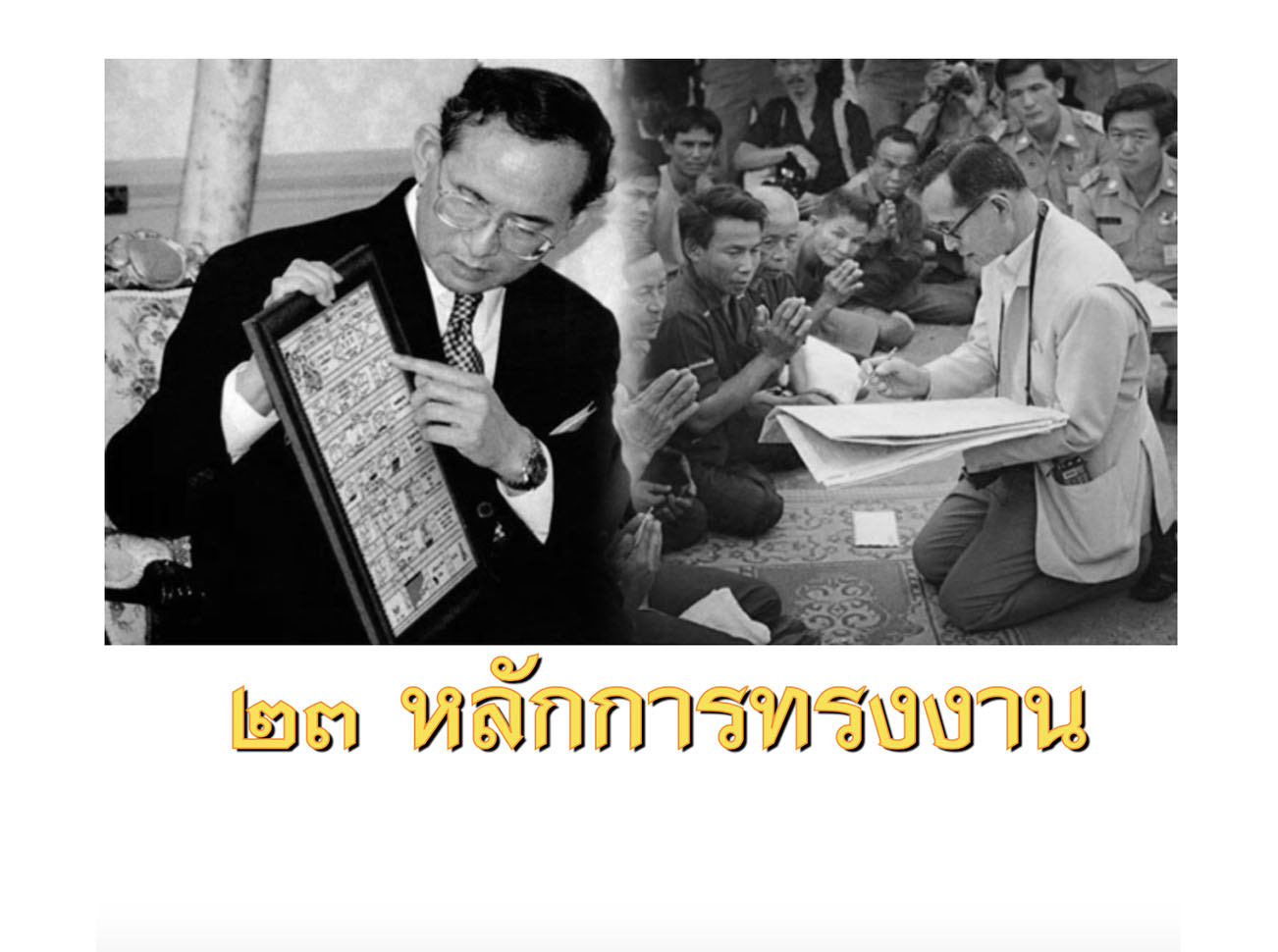 ตลอดระยะเวลาแห่งการครองราชพระบาทสมเด็จพระบรมชนกาธิเบศร มหาภูมิพลอดุลยเดชมหาราช บรมนาถบพิตร ทรงงานเพื่อประโยชน์สุขแห่งปวงประชา ซึ่งหลักการทรงงานของพระองค์สามารถนำมาประยุกต์ใช้ได้กับการทำงานและการใช้ชีวิต จึงขอรวบรวมไว้มาให้เป็นมรดกแก่ลูกหลาน
