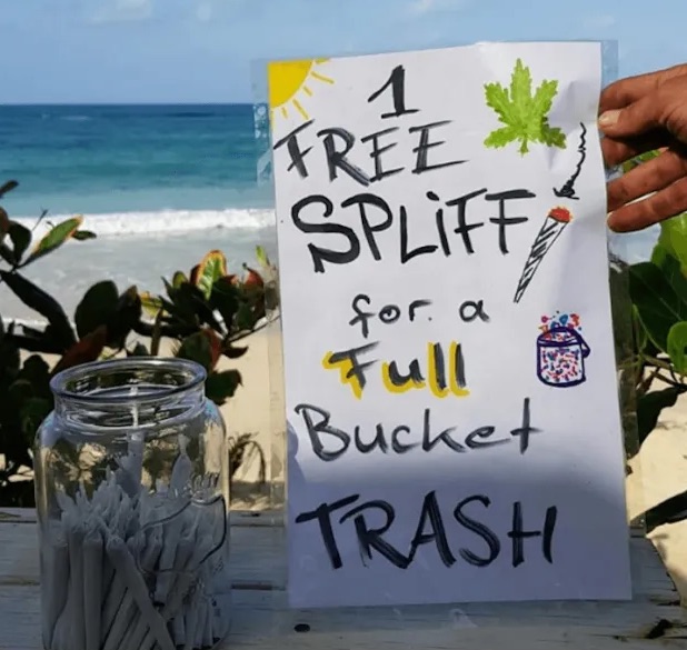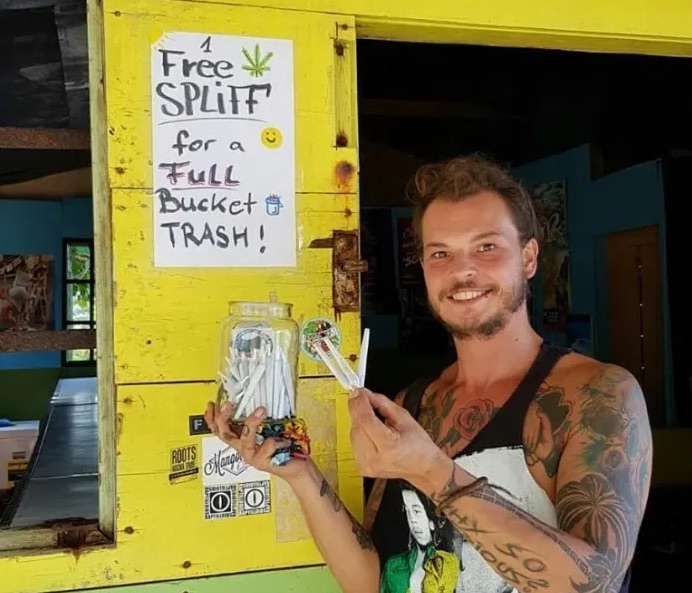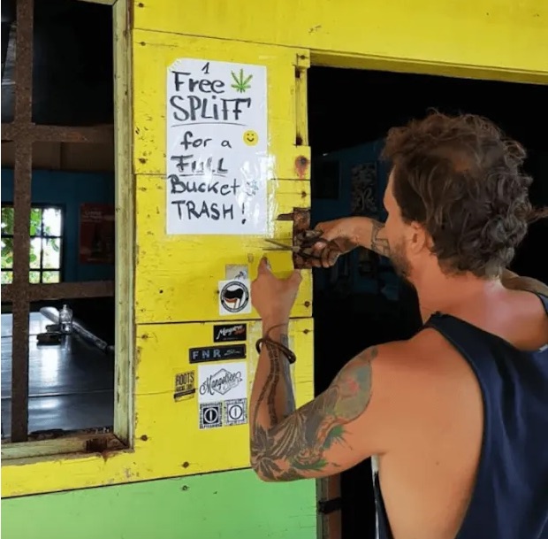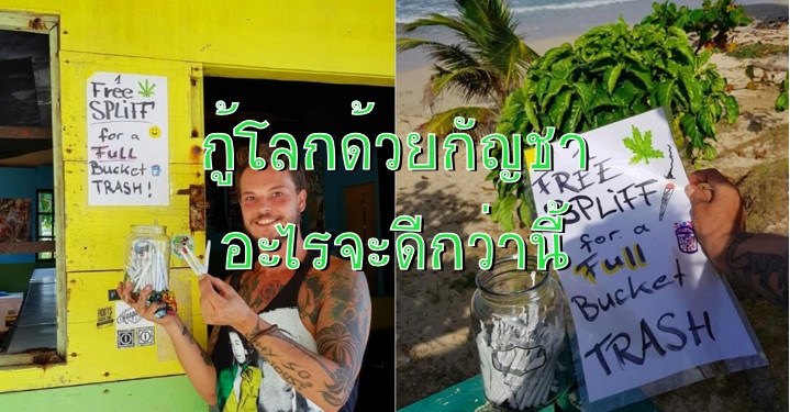ที่จาเมกาและที่พักชื่อเยอรมันโฮสเทล Germaican เก็บขยะจากชายหาดให้เต็มถังโฮสเทลจะตอบแทนด้วยบุหรี่ที่มวนด้วยกัญชาหนึ่งมวน !