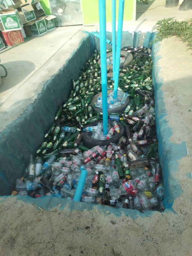 หมายเหตุ ในการทำธนาคารน้ำใต้ดินยุคแรกๆ จะมีการแนะนำให้ใช้ยางรถยนต์และขวดพลาสติกเป็นวัสดุ แต่จากข้อมูลพบว่าไม่เหมาะสมเพราะอาจจะมีผลทำให้น้ำปนเปื้อนจึงขอให้ใช้เป็นวัสดุธรรมชาติ เช่นอิฐหินหรือขวดแก้วจะเหมาะสมกว่า