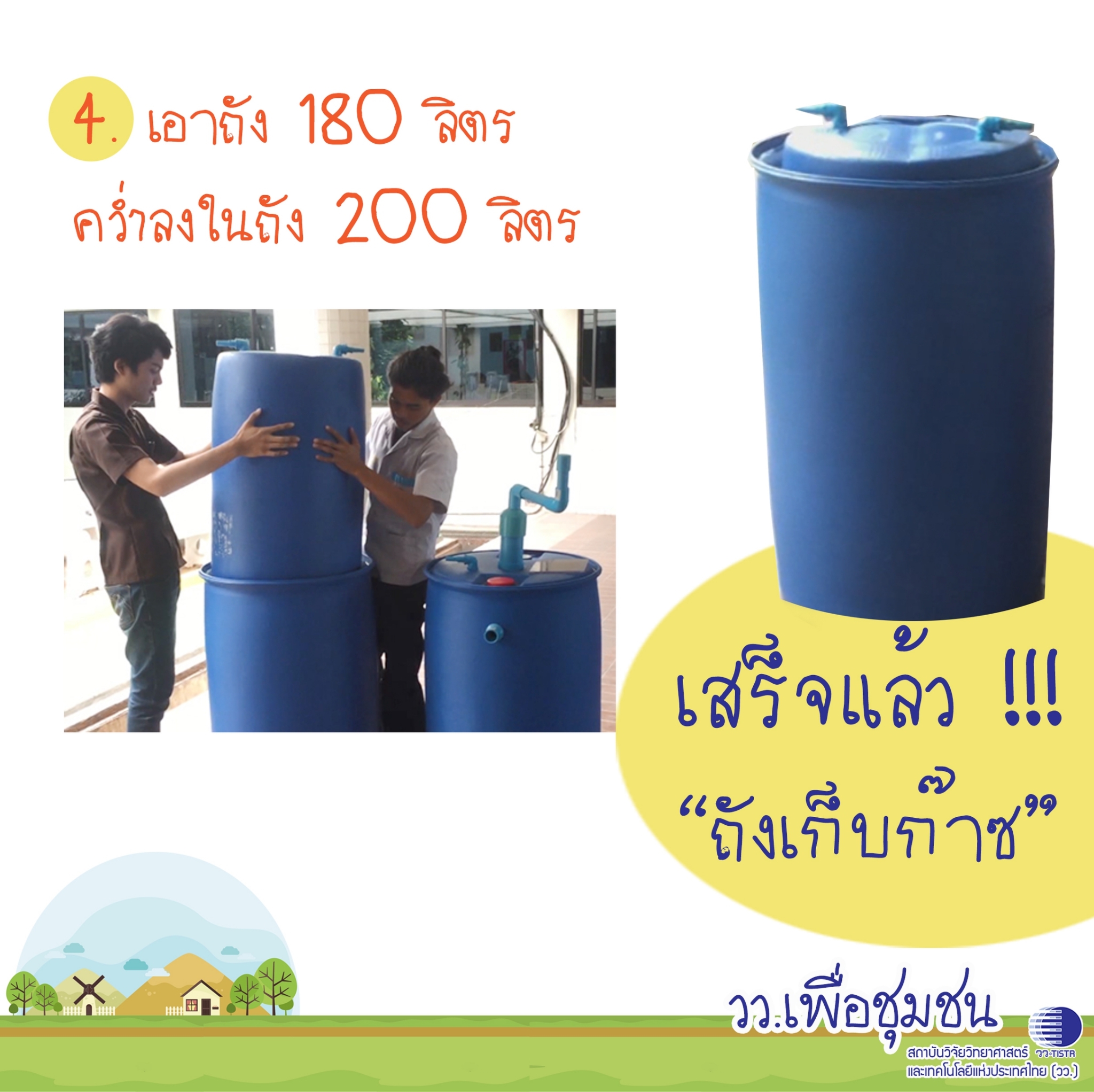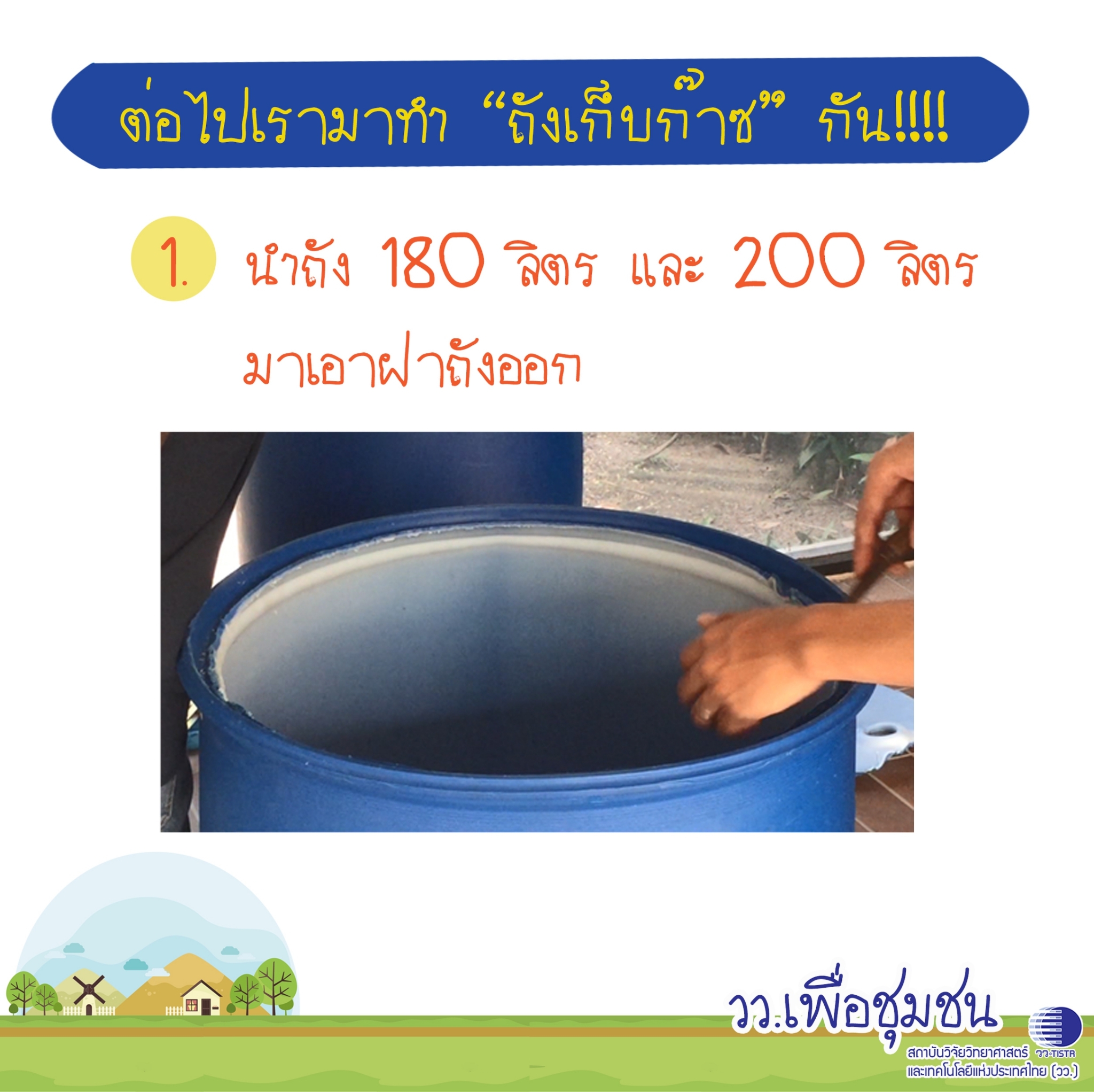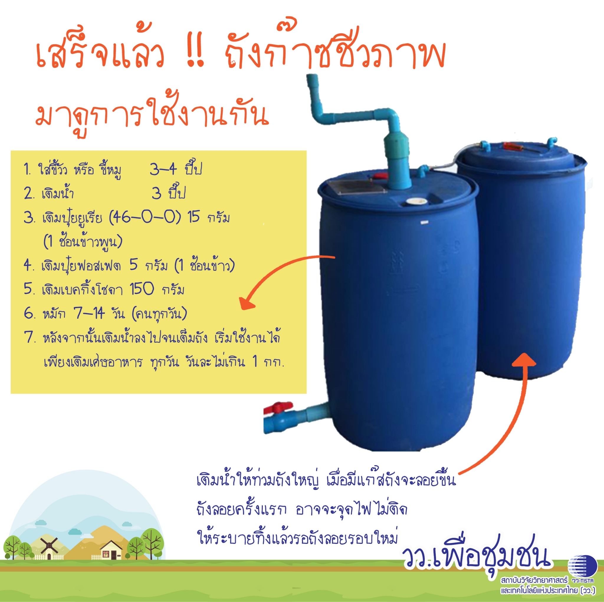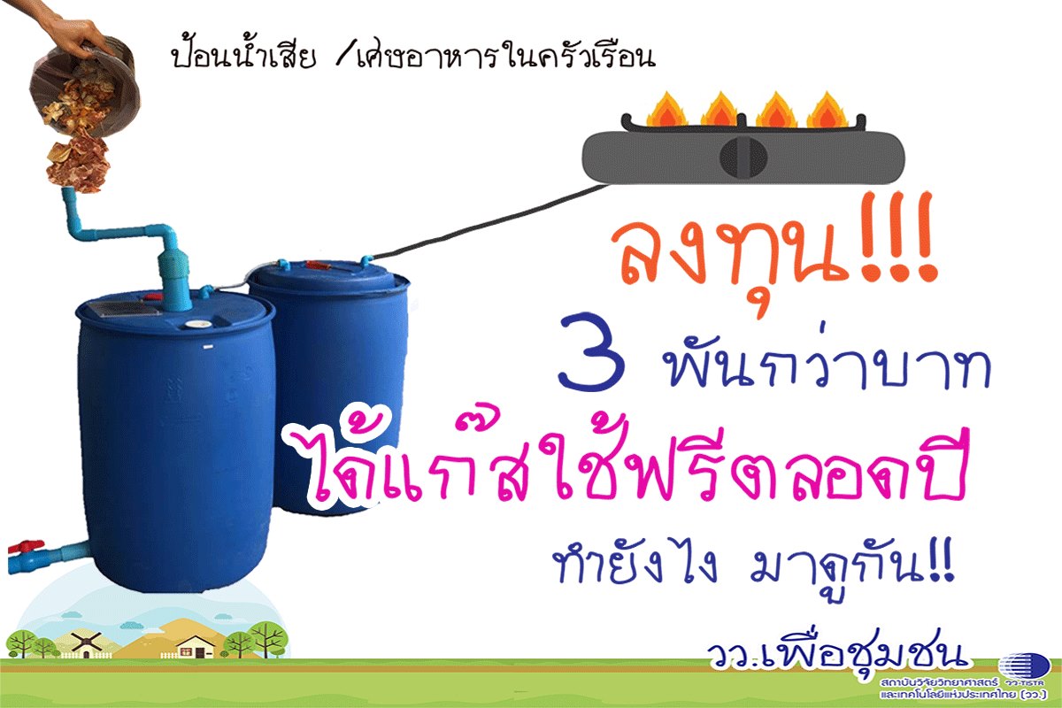 ศูนย์เชี่ยวชาญนวัตกรรมพลังงานสะอาดและสิ่งแวดล้อม สถาบันวิจัยวิทยาศาสตร์และเทคโนโลยีแห่งประเทศไทย (วว.) นำเสนอแบบการทำ ถังหมักแก๊สชีวภาพ ที่สามารถเอาน้ำเสีย เศษอหารภายในบ้านมามักทำให้เกิดแก๊สหุงต้ม แถมได้ปุ๋ยหมักจากเศษอาหารด้วย