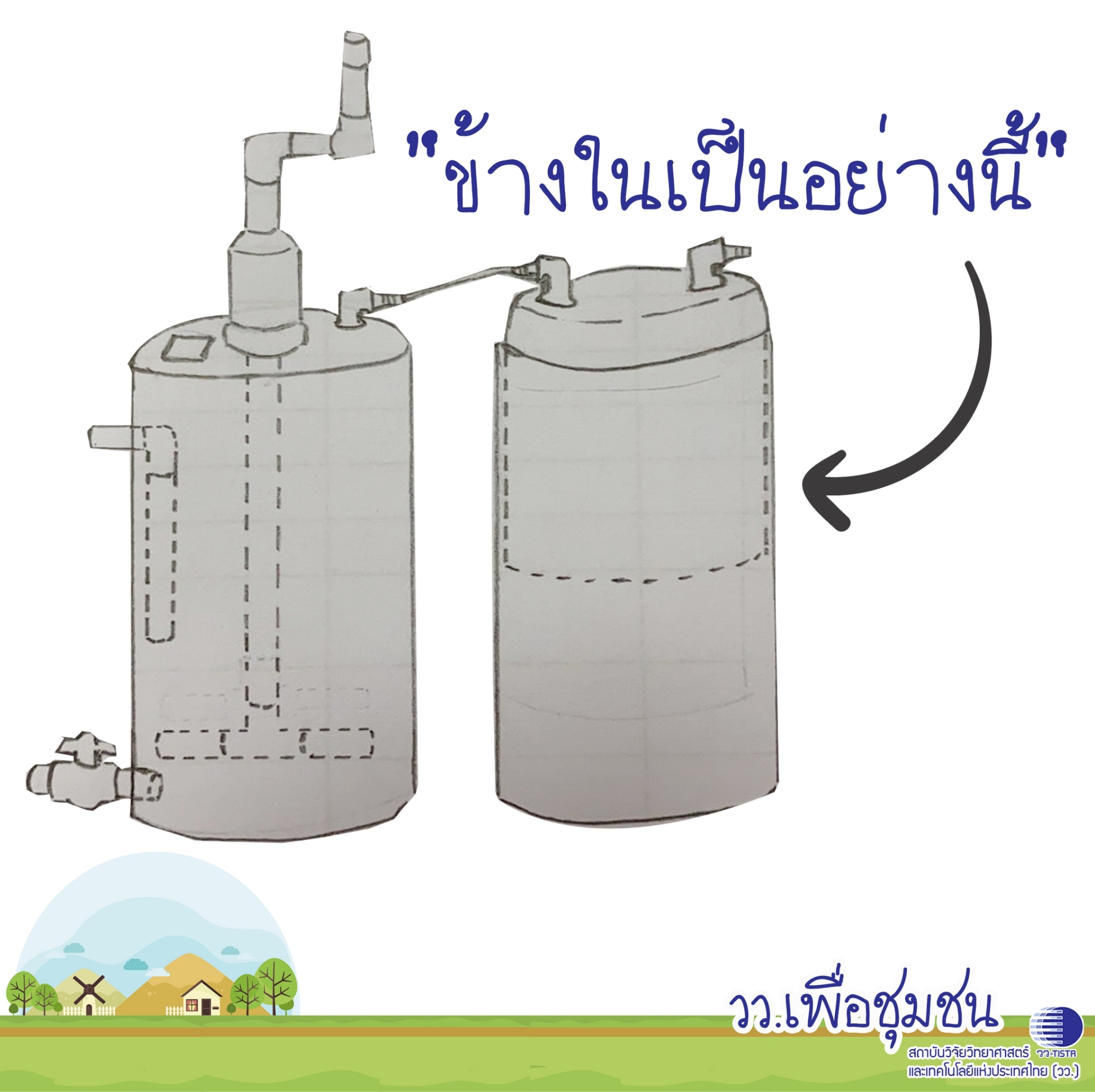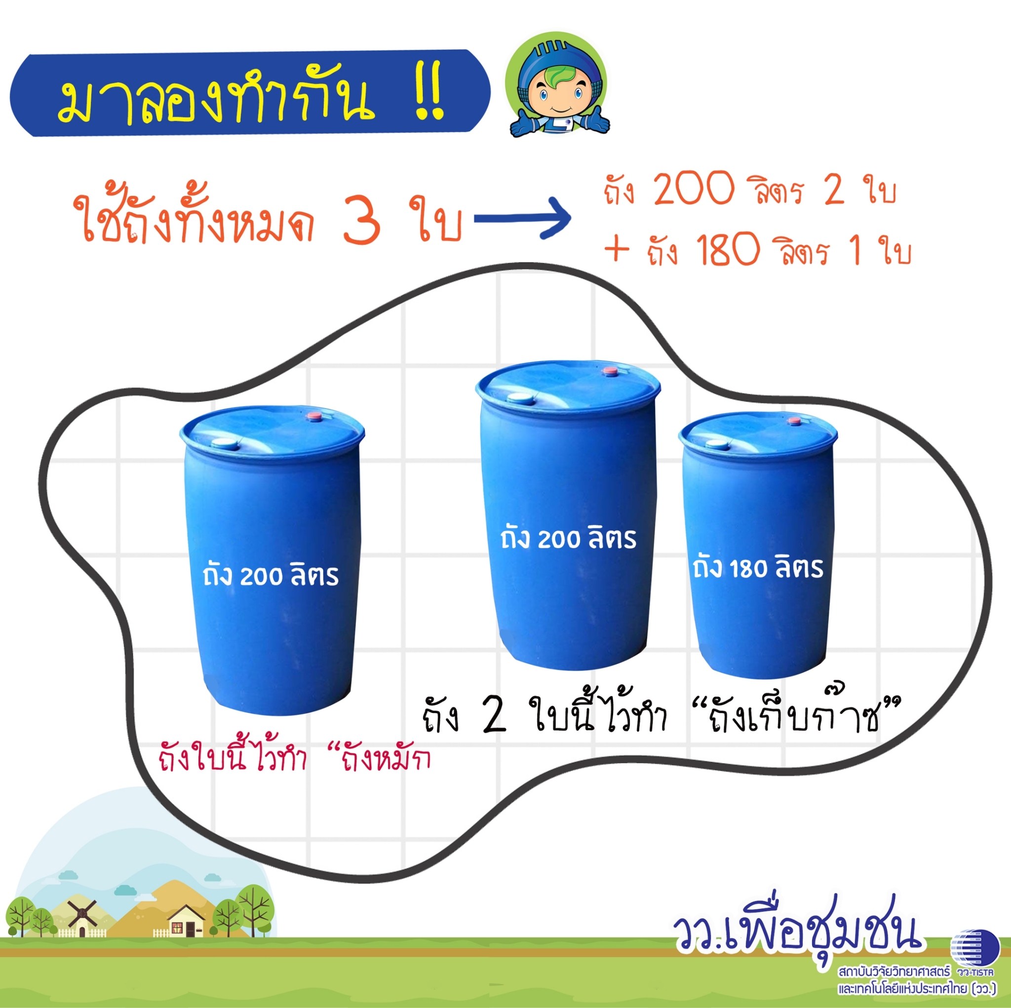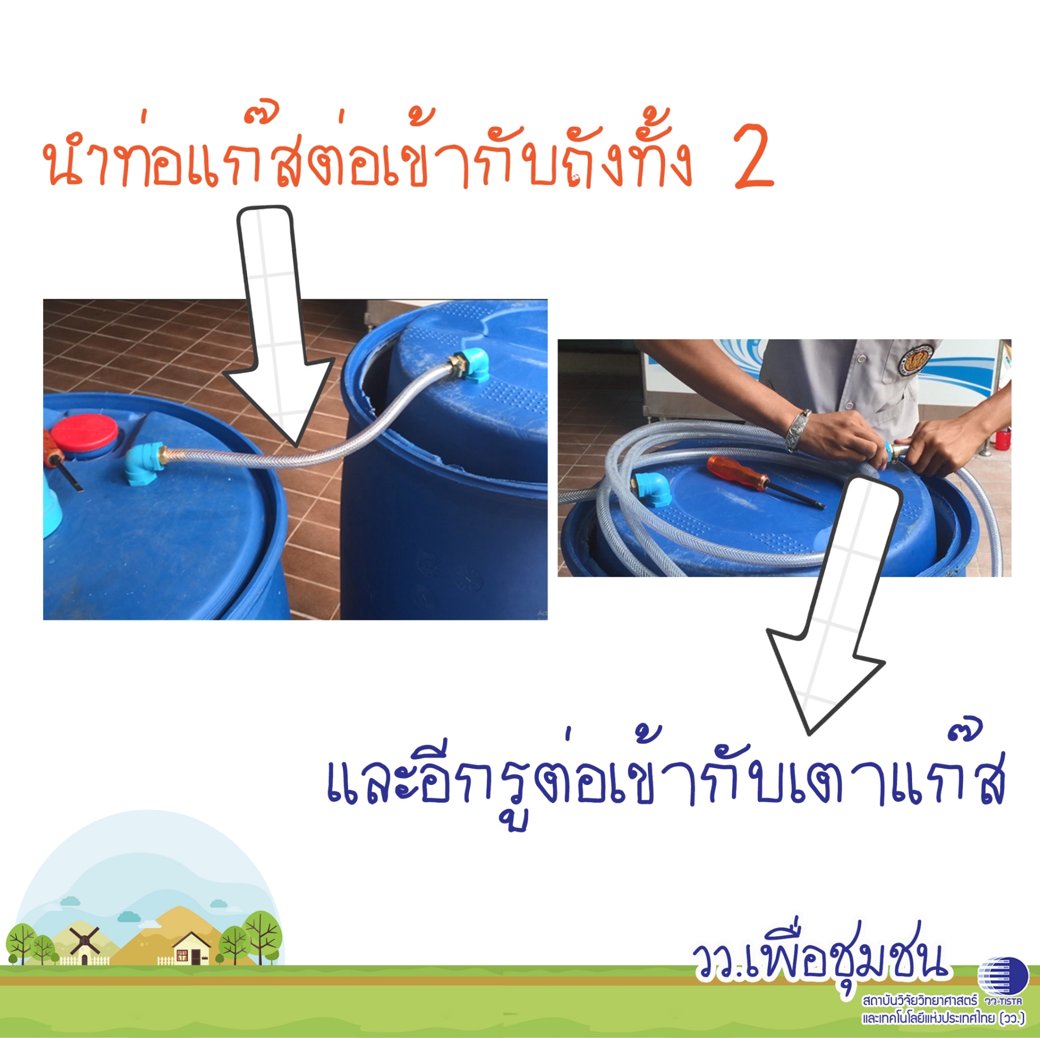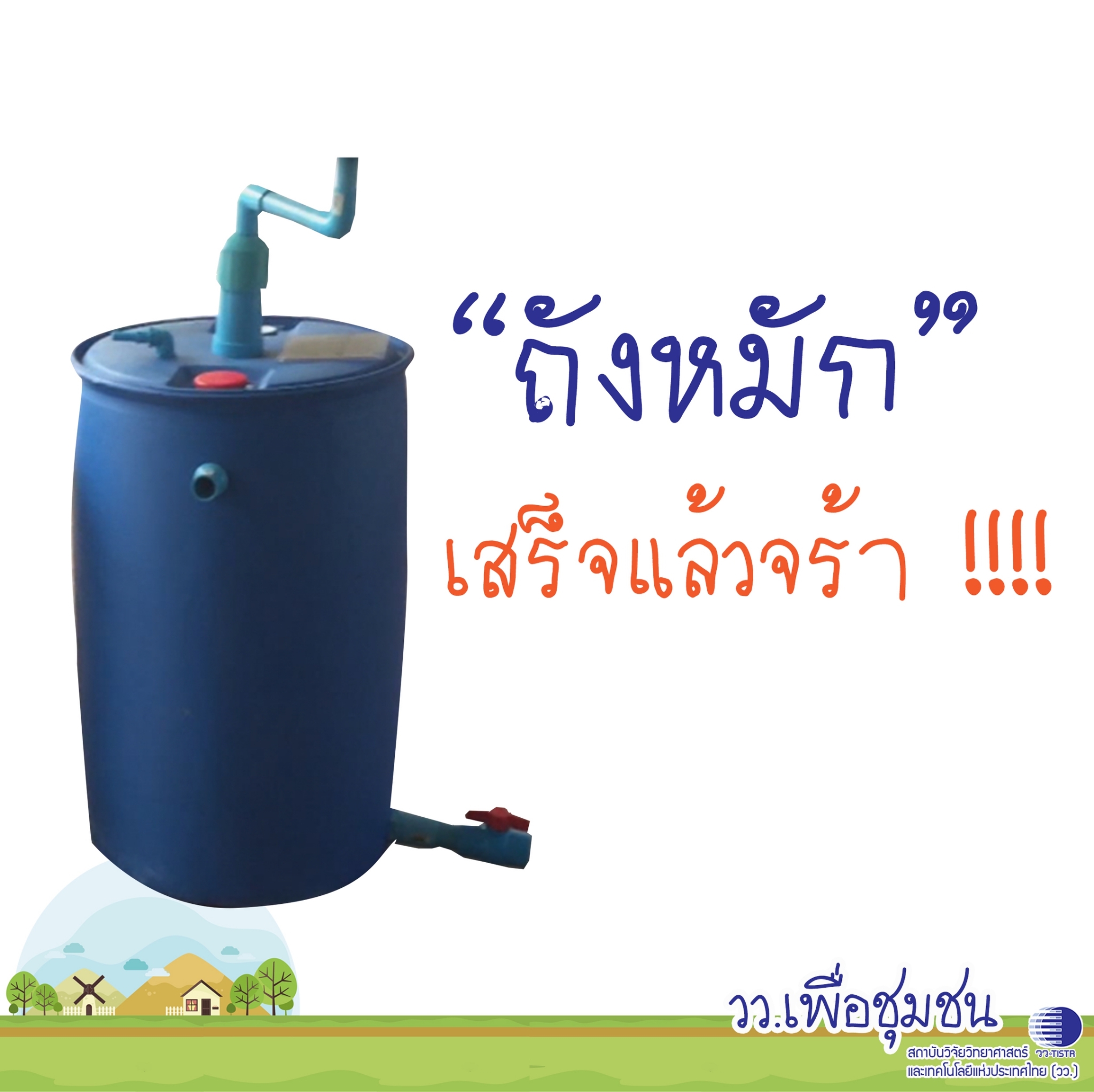 ศูนย์เชี่ยวชาญนวัตกรรมพลังงานสะอาดและสิ่งแวดล้อม สถาบันวิจัยวิทยาศาสตร์และเทคโนโลยีแห่งประเทศไทย (วว.) นำเสนอแบบการทำ ถังหมักแก๊สชีวภาพ ที่สามารถเอาน้ำเสีย เศษอหารภายในบ้านมามักทำให้เกิดแก๊สหุงต้ม แถมได้ปุ๋ยหมักจากเศษอาหารด้วย