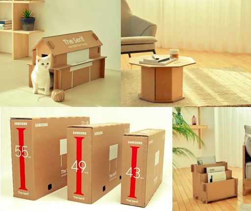 เวลาซื้อเครื่องใช้ไฟฟ้ามา สิ่งที่คนส่วนใหญ่มักจะทิ้งก็คือกล้องใส่ที่มากจะมีขนาดใหญ่ที่ทำจากกระดาษลูกฟูกที่มีความแข็งแรงมากถ้าออกแบบดีๆ ซัมซุงเลยออกแบบกล่องให้สามารถเอามาประกอบเป็นเฟอนิเจอร์เครื่องใช้ หรือแม้แต่บ้านแมวได้ซะเลย