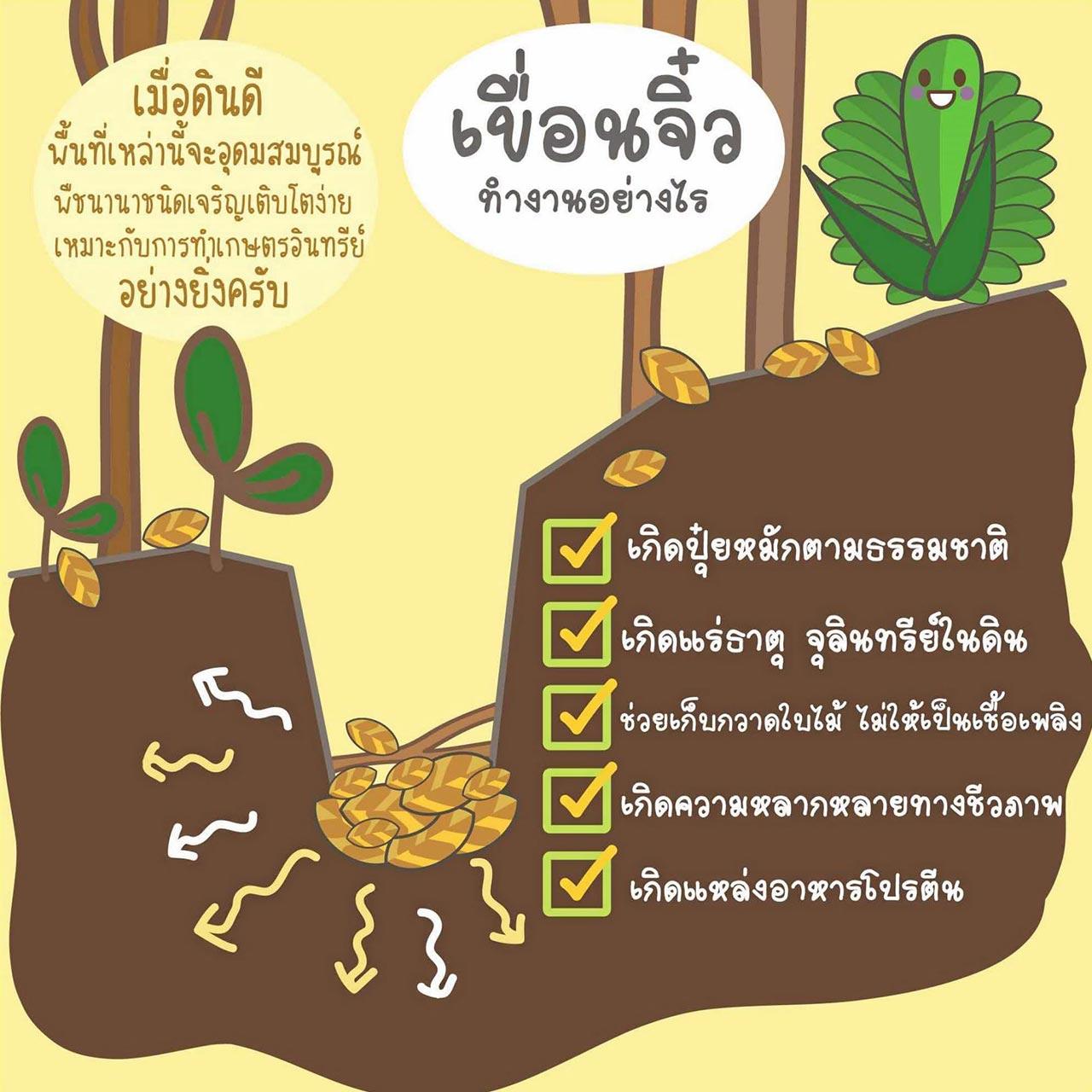 - เป็นที่หลบภัยและเพาะเลี้ยงแมลง สัตว์ผิวดินที่จะกลายเป็นแหล่งอาหารโปรตีนแก่ชาวบ้านและสร้างสมดุลของระบบนิเวศน์วิทยาในป่าได้ดีขึ้นฯ